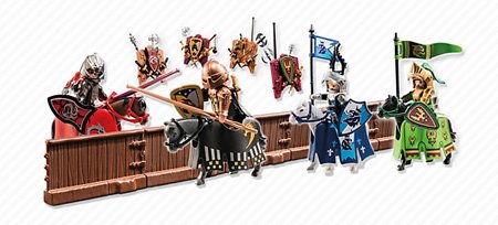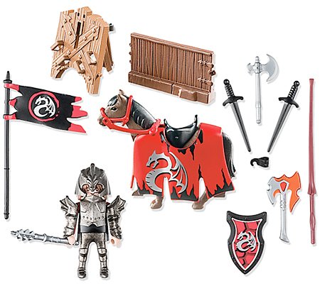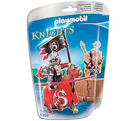 Protect your territory with the Dragon Tournament Knight. Use his trusty steed to dodge attacks from the enemy. Seek protection from the enemy behind the tournament fence or connect it to any other fence from the collectible Knights bags to create a complete jousting arena. Then, take the battle online with the Knights game also available on iOS and Android devices. Set includes one figure, horse, shield, armor, fence, and other accessories. Play with this set on its own or combine with any of the other PLAYMOBIL Knights sets. Recommended for ages four to ten.