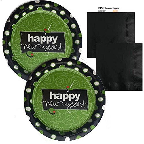 - SET INCLUDES: 36 New Year Appetizer or Dessert Plates, 40 Black Dinner Napkins & 1 Recipe. Plates feature the words happy new year!, polka dot trim & olives.