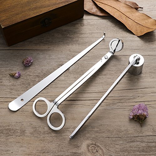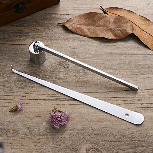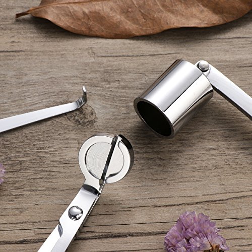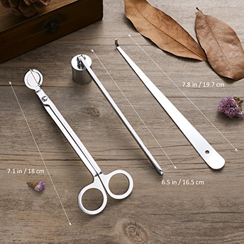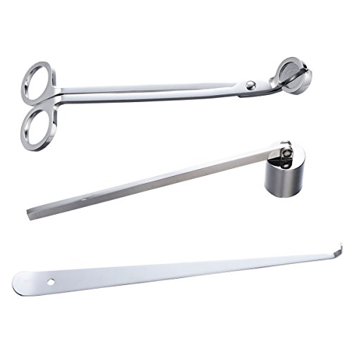Feature - Color: Silver. - Material: Stainless steel. - Length of candle wick trimmer: About 18cm/7.1inch. - Length of candle wick dipper: About 16.5cm/6.5inch. - Length of candle snuffer: About 19.7cm/7.8inch. - Trim candle wick to prevent soot and add candle burn time. - Snuff candle using a wick dipper to prevent wick smoldering. - Snuff tapered candles with bell snuffer to prevent wax flying off tip of candle. - Made of high quality stainless steel, the candle accessory set is durable and long lasting use.