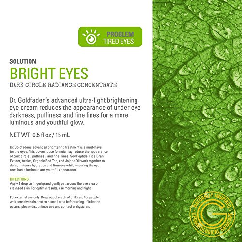 GOLDFADEN MD GOLDFADEN MD: Bright Eyes "Dark Circle Radiance Concentrate" .5oz Dr. Goldfaden's advanced brightening treatment is a must-have for the eyes. This powerhouse formula instantly reduces the appearance of dark circles, puffiness, and fine lines. Soy peptide, vitamin K, Rice Bran Extract, Organic Red Tea and Jojoba Oil work together to deliver intense hydration and firmness while ensuring the eye area has a luminous and youthful appearance. Perfect for all skin types. Features: - Visibly brightens eye area