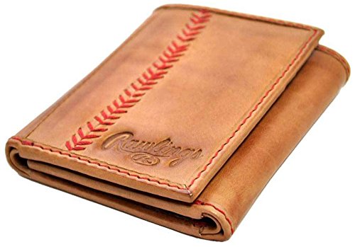 Rawlings Baseball Stitch Leather Trifold Wallet The Rawlings Baseball Stitch Leather Trifold Wallet features a red stitch detail and Rawlings embossed logo on the outside. Inside you’ll find multiple card pockets, an ID window, a full length bill holder and 100% cotton twill lining. • Dimensions: 4" x 3" • Rawlings wallet box is included Colors: $color$