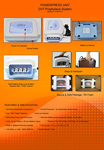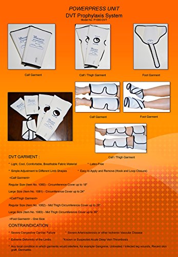 -. Feature : Intermittent Pneumatic Compression DVT Pump with 1 pair of Calf Garment or Calf/Thigh Garment or Foot Garment. Include 1 pair of 60" Tubing Hose. 220V available, ship to worldwide, If you need Extra Garment or Tubing Hose, Please visit our Amazon Store. / Hook and Loop Closure (Velcro Type) Garment Adjustable Size: Circumference Cover up to Calf Garment(Regular) - 18", (Large) - 24" , Calf/Thigh Garment(Regular) - 28" thigh, (Large) - 35" thigh, Foot - One size / Preset Pressure - No adjustment, Easy of Use. Power on Indicator Light, Foot or Calf or Calf/Thigh Treatment / Self-sealing Snap-Lock Connectors, Alternate Inflation (Second garment inflates 15 sec after), Single or Bilateral Use / Cycle Time: 15 sec inflation / 45 sec deflation(appx), Foot Pressure - 80 mmHg, Calf/Thigh Pressure - 40 mmHg(appx). Breathable Fabric Material, Latex Free