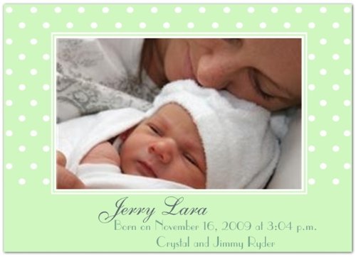 Studio : Storkie Express Publisher : Storkie Express Binding : Baby Product Product Description Birth Announcements: "Polka on Mint" features your baby's photo on this cute, contemporary design. The mint background is complemented by white polka dots accenting the 0