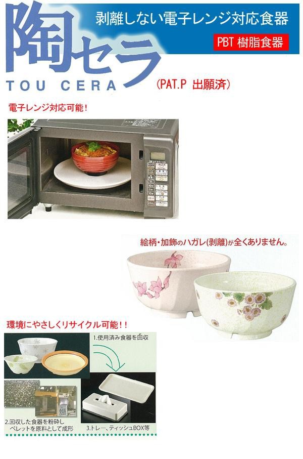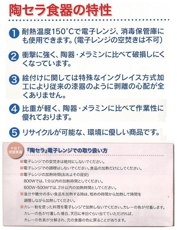 衝撃に強く、陶器・メラミンに比べて破損しにくくなっています。絵付けに関しては、特殊なイングレイス方式加工により従来の漆器のように剥離の心配がありません。 |