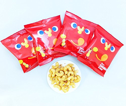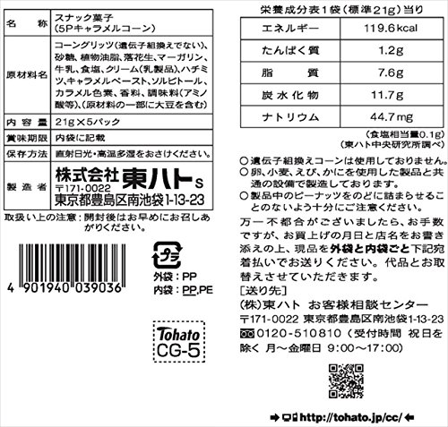 原材料:コーングリッツ(遺伝子組換えでない)、砂糖、植物油脂、落花生、マーガリン、牛乳、食塩、クリーム(乳製品)、ハチミツ、キャラメルペースト、ソルビトール、カラメル色素、香料、調味料(アミノ酸等)、(原材料の一部に大豆を含む)
