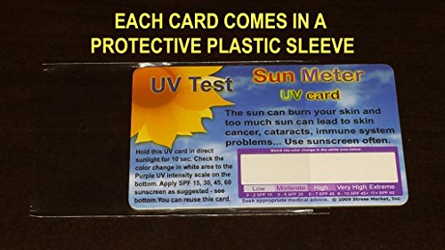 With the depletion of the ozone layer, the number of skin cancer and other health problems has risen dramatically, and the public is being advised to avoid prolonged exposure to the sun. But on any given day, how much exposure is too much, and how much SPF protection is enough? The credit card sized UV Meter Card is designed with a remarkable UV sensitive strip which changes from white to a shade of purple when exposed to UV radiation for only 10 seconds. Designed to react primarily to the wavelengths of lights between 290-325 nm, (the UV range) which are known to be the sunburn and skin damaging rays. The stronger the radiation, the darker the shade of purple. Simply compare on the adjacent color matching chart to see the corresponding "likelihood of sunburn" warning. Guidelines printed right on the meter card allow the user to determine the sun-screen SPA level required under the prevailing conditions [this is not a high precision instrument]. Reading Radiation Levels. Low - Use low sunscreen protection. High - Use a good sunscreen. Extreme - Use highest sunscreen or sun block and stay in the sun for only a short amount of time. You can now take immediate measurements to ensure that you are protecting the health of your family, friends, and associates. The card will change back to its original color within minutes and can be reused hundreds of times. Great for days at the beach, camping, boating. outdoor sports, and perfect for anyone who works outdoors. Also great for student projects. An excellent product to promote and market your spa, wellness center, cosmetic line, plastic surgery, outdoor clothing, sun screen, etc. You will receive - 6 Sun Meter UV cards, Plastic CardsFeature