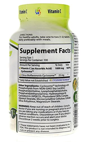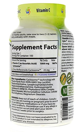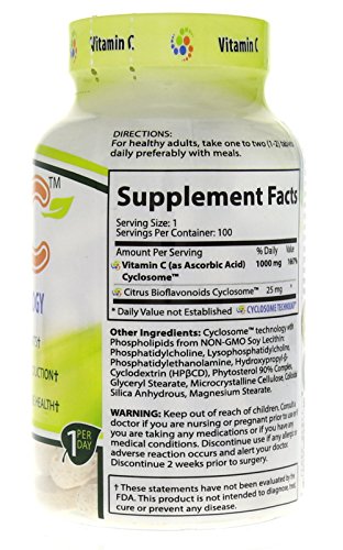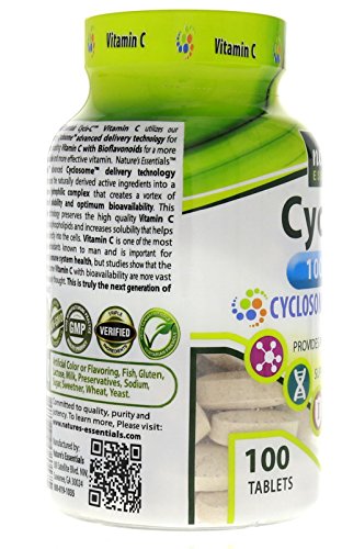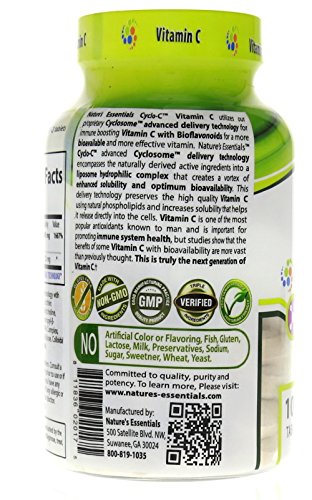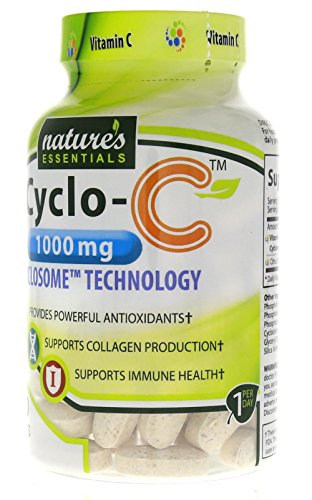 -. Binding : Health and Beauty -. Brand : Nature's Essentials -. Feature : The Next Generation Of Wellness 100% SATISFACTION GUARANTEE: if you aren't satisfied with your product, then return it for your money back, no questions asked! / Scientifically Advanced Absorb-Rx Cyclosome Technology for highest bioavailability in the market. Naturally Simple: Pure Triple Verified ingredients without unwanted chemicals or fillers. / Non-GMO * Provides Powerful Antioxidants * Supports Immune Health * Supports Collagen Production / Gluten-Free * Lactose Free * Sugar-Free * Sodium Free * No Preservatives / Nature's Essentials advanced Cyclosome delivery technology to encompass the naturally derived active ingredient Curcumin into a liposomal hydrophilic complex that creates a vortex of enhanced solubility and optimal bioavailability. -. IsAdultProduct : 0 -. Label : Nature's Essentials -. LegalDisclaimer : Other Ingredients: -. Manufacturer : Nature's Essentials -. MPN : NECYC100 -. PackageQuantity : 1 -. PartNumber : NECYC100 -. ProductGroup : Health and Beauty -. ProductTypeName : HEALTH_PERSONAL_CARE -. Publisher : Nature's Essentials -. Size : 100 Tablets -. Studio : Nature's Essentials -. Title : Nature's Essentials Cyclo-C Vitamin C 1000mg 1st of its Kind CYCLOSOME Delivery Technology. Non-GMO, Gluten Free 100 Tablets