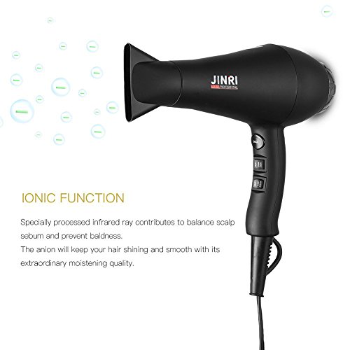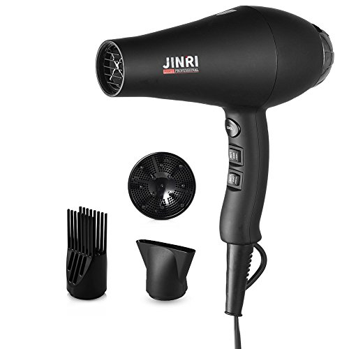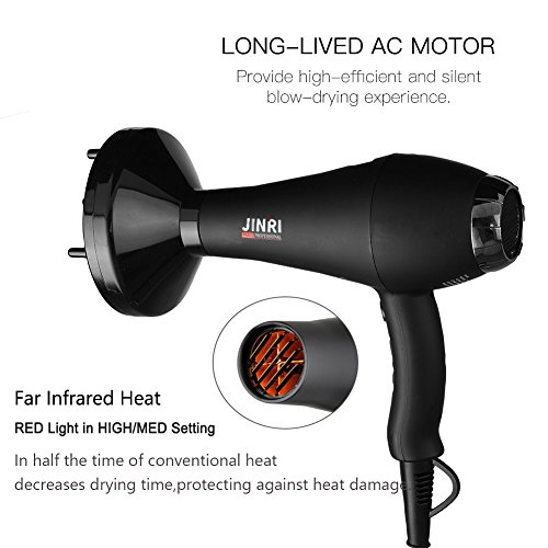 Jinri Salon Grade Professional Hair Dryer 1875W AC Motor Negative Ionic Ceramic Far Infrared Blow Dryer With 2 Speed and 3 Heat Settings Cold Shot Button, Diffuser and Straightening Comb Pik(Black)