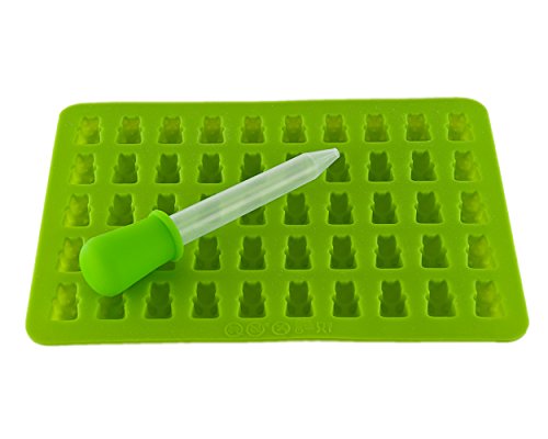 Adorable 50 cavities gummy bear silicon mold in a vibrant spring green color with Bonus 5 ml filling dropper. Enjoy making cute yummy bear candies, chocolates, vitamins, fruit snacks and even ice cubes for everyday treats, birthday, baby shower and holidays.