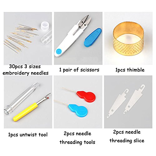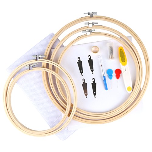 - Package Content: 5 x bamboo embroidery hoop (6", 7.2", 8", 9.2", 10.4"), 100 Color Threads, 2pcs embendory cloth, 30pcs 3 sizes embroidery needles, 4pcs cross stitch needle-threading tools, 1 pair of scissors, 1pcs thimble, 1pcs untwist tool.