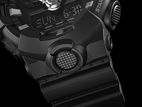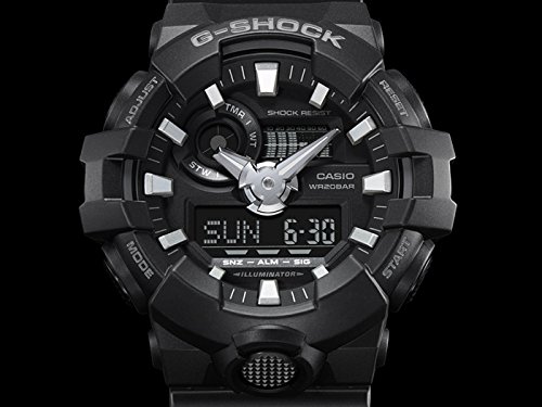 Brand, Seller, or Collection Name:Casio Model number:GA-700-1BER Part Number:GA-700-1BER Model Year:2016 Item Shape:Round Dial window material type:Mineral Display Type:Analog and digital Clasp:Buckle Case diameter:5.4 centimeters Case Thickness:19 millimeters Band Material:Plastic Band length:men Band width:26 millimeters Band Color:Black Dial color:Black Bezel material:Resin Calendar:Day, date, and month Item weight:2.72 Ounces Movement:Quartz Water resistant depth:200 Meters