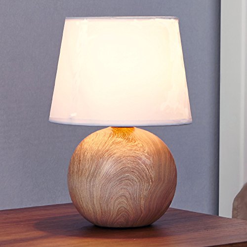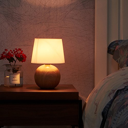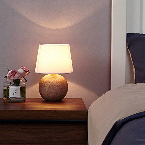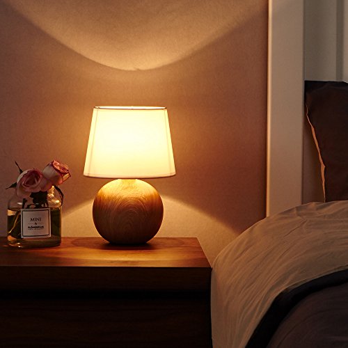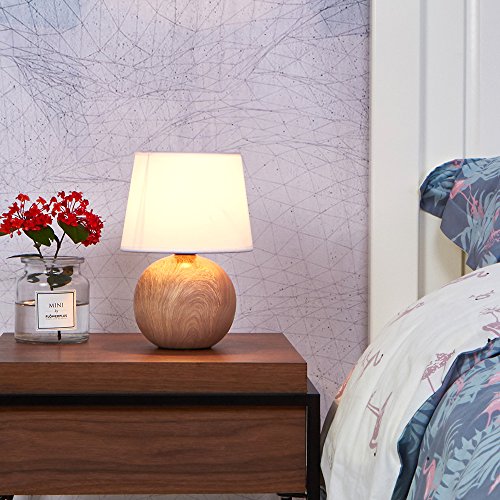IKEBANA 10.62 Inches White Fabric Ceramic Small Wood Bedside Table Lamp, Durable Round Table Lampes For Living Room Bedroom