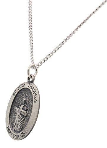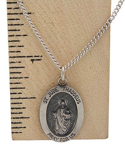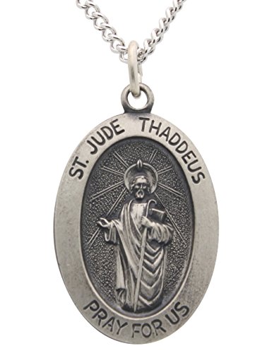 St Jude is one of the twelve apostles who is called upon when the impossible is needed. The center of the medal has an embossed image of St Jude holding a staff. The words "ST. JUDE THADDEUS PRAY FOR US" encompass the front. The medal has raised sections with a mixture of satin and polished finishes.