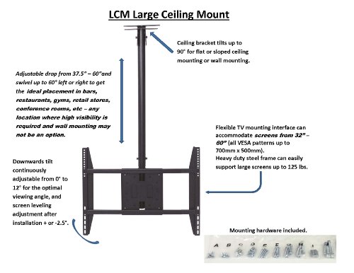 -. Feature : Flexible TV mounting interface can accommodate screens from 32-Inch - 60-Inch (all VESA patterns up to 700mm x 500mm) / Adjustable drop from 37.5-Inch - 60-Inchand swivel up to 60° left or right to get the ideal placement in bars, restaurants, gyms, retail stores, conference rooms, etc / Heavy duty steel frame can easily support large screens up to 125 lbs. Mounting hardware included / Downward tilt adjustable from 0° to 12° for the optimal viewing angle / Ceiling bracket tilts up to 90° for flat or sloped ceiling mounting or wall mounting. Screen leveling adjustment after installation + or -2.5°