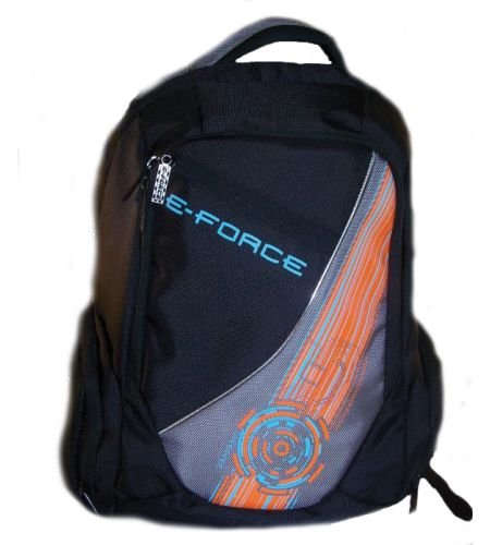 E-Force Racquetball Backpack. The E-Force Racquetball Backpack has been completely redesigned for comfort and utility. The front pocket keeps you organized with inner pouches and a key finder. Two side pockets give you even more storage space; one doubling as a wet pocket. Extra padding on the back and straps make this backpack ultra comfortable all day long. The large back racquet pocket holds 2-3 racquets and the main compartment has plenty of storage for the rest of your racquetball gear. Dimensions: 19.6" x 6.7" x 11.8". Color: Black/Orange. MFG#: 71522.