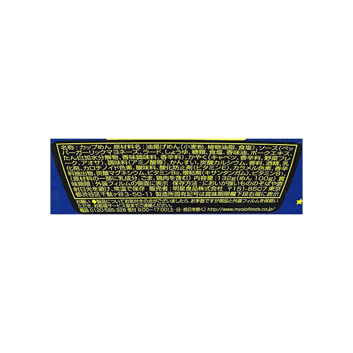 원재료:유부 면(소맥분,식물성 기름지,식염)고, 소스(페퍼 마늘 마요네즈,라드,간장,당류,식염,향기 맛유,포크 엑기스,단백 가수분해물,향기 맛 조미료,향신료)고, 인지(든가) 질투하다(양배추,향신료,야채 flake,《아오사》)고, 조미료(아미노산등)고, 물어 들이마시고, 탄산 칼슘,향료,주정,유화 제,카로 치노 이 드 색소,신맛료,산화 방지제(비타민E)고, 카라멜 색소,향신료 추출물,탄산 마그네슘,비타민B2,증점제(산탄검(Xanthan Gum))고, 비타민B1,(원재료의 일부에 유성분,참깨,닭고기를 포함한다)