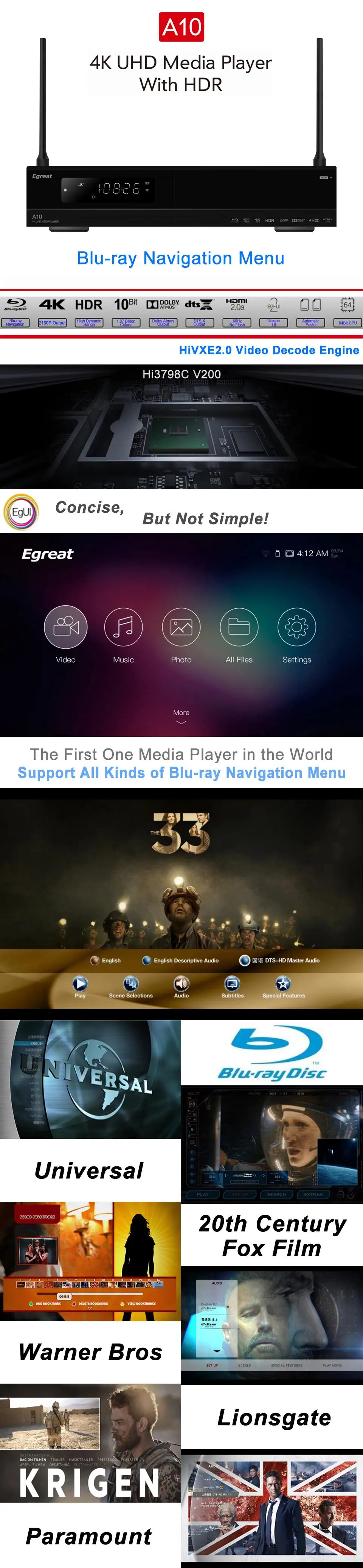 Egreat A10 4K UHD Media Player Hi3798CV200 2G/16G AC WIFI Gigabit LAN HDR10 Blu-ray 3D Dolby ATOMS DTS