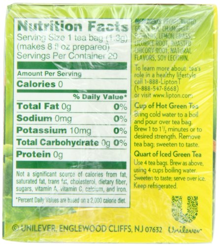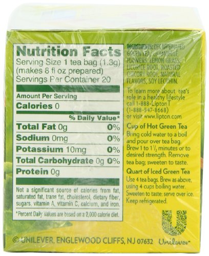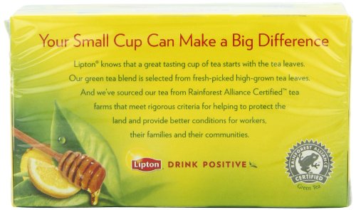 -. Feature : Naturally decaffeinated green tea infused with the delicious blend of honey and lemon / Pack of six 20-count tea bag boxes (total 120 tea bags) / Contains 70 mg of flavonoids per 8 fluid ounce serving, is 100% natural, caffeine free, no preservatives or coloring / LIPTON® green tea is characterized by a delicate, clean taste, subtle aroma, and a beautiful pale green color / Ships in Certified Frustration-Free Packaging