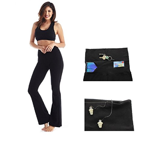 Feature : Two elastic compartments in the front - Room for your phone, credit cards, money or music player. | Key hook for your keys | Convenient hole to put your earphones through when listening to music. / Specially designed | 250gsm (thickness) | 92% Cotton | 8% Spandex / Model is 5' 7" wearing a small. / These flared pants are great for your casual everyday wear or for working out. / Viosi branded products are ONLY sold by Newport Blvd.