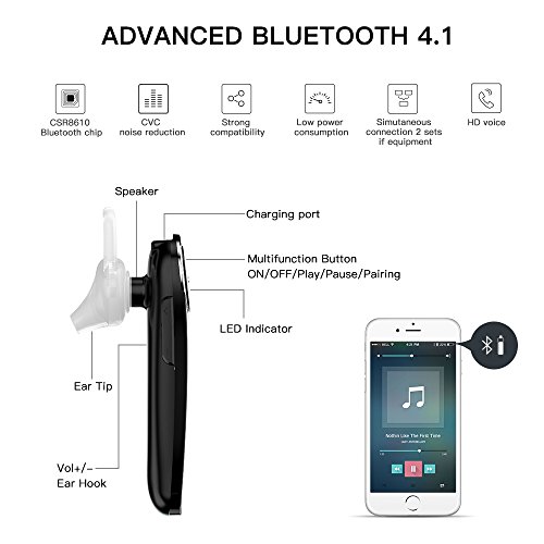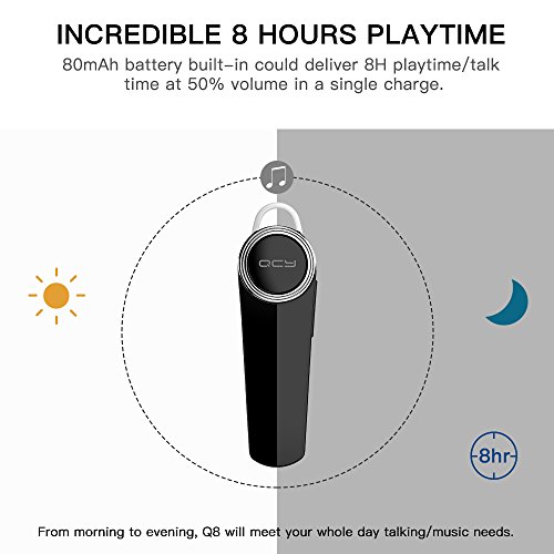 Specifications: Brand: QCY Model Number: Q8 Bluetooth Version: Bluetooth 4.1 Dimension: 55.6×18×8.2mm Weight(Each): 7.9g Charge Port: Micro USB Operation range: 5m(without any obstacle between cellphone and earphone) Supported profiles: HFP/HSP/A2DP/AVRCP Broad Compatibility, Fast Paring The Wireless Earpiece can pair with 2 Bluetooth devices at the same time. Compatible with Bluetooth enabled devices,including most of the iPhone Android cellphones,tablets,iPad Air,iPod,MP3,PC,PS3,laptops,etc. Versatility one key button - on/off/pause/pairing/quick mute/reject a call/re-dial/hang up your phone. Besides, the iphone can show the battery status on your phone, so easy to control it. ?How to Pair: 1. Before using the headset, please use the USB charging cable to fully charge it first(about 2 hours). 2. Press the power button of the headset for 5-6 seconds or longer until you see the blue-red light blinking alternately it will automatically enter pairing mode. 3. Make sure your phone's Bluetooth function turned on, search headset model on it. 4. Select the Bluetooth model and connect. Enjoy Music, Enjoy Life! Package Includes: 1x Wireless Headphones 1x USB Charging Cradle (With Power Bank) 3x Eartips (S/M/L) 1x User Manual 1 X Ear Hook Warranty Guaranteed Reliability We believed our product, that's why we back them all with an 12-month warranty and 30 days money-back guarantee of the device fails due to a manufacturing defect and provide friendly ,easy-to-reach support. In addition, we provide top notch customer service for all of QCY Bluetooth Headphones. If you have any further questions, please no hesitate contact us.