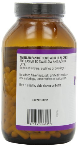 Twinlab Pantothenic Acid (B-5) Caps are easy to swallow and assimilate. Well tolerated by most highly allergic individuals. No tablet binders, coatings, flavorings, salt, artificial sweeteners, preservatives or salicylates added.Feature