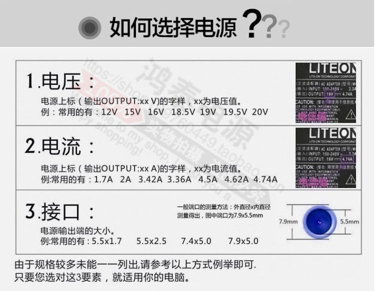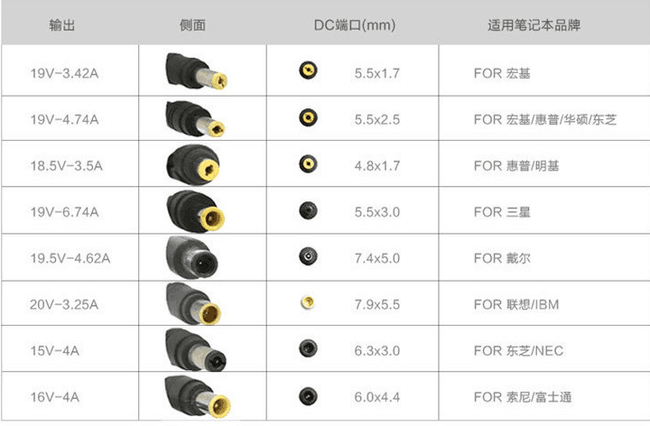 [机型导购]:如果您不知道机器是否能用这个适配器,可以查看您原装的适配器的输出参数(电压,电流)是否相符,如果原来的适配器弄丢了,可以查看电脑底部的参数或者您机器的说明书。