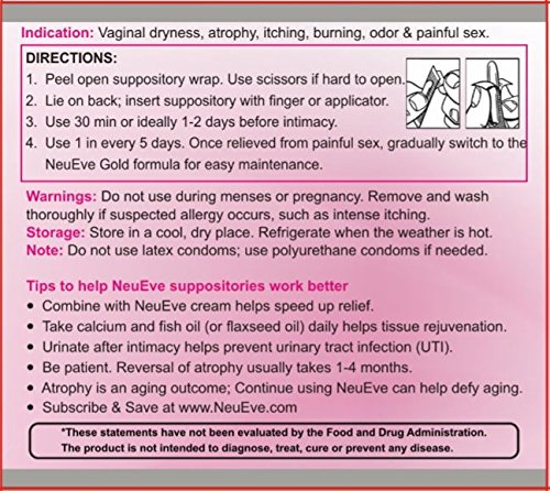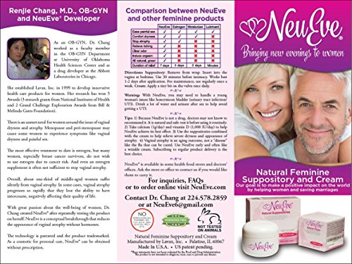 Ease vaginal dryness, painful sex, and clear BV. Help women with lichen sclerosus, Sjogren's syndrome. Reverse vaginal atrophy; works well when combined with the NeuEve cream