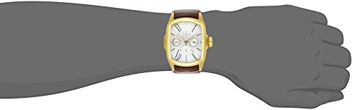 Watch with elongated gold-tone case featuring textured dial with 24-hour, 60-second, date, and retrograde day-of-the-week subdials
