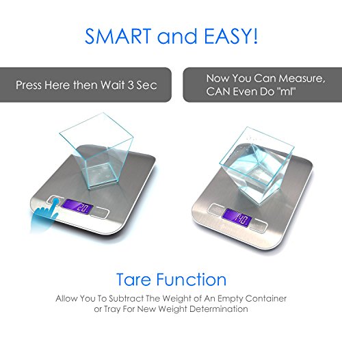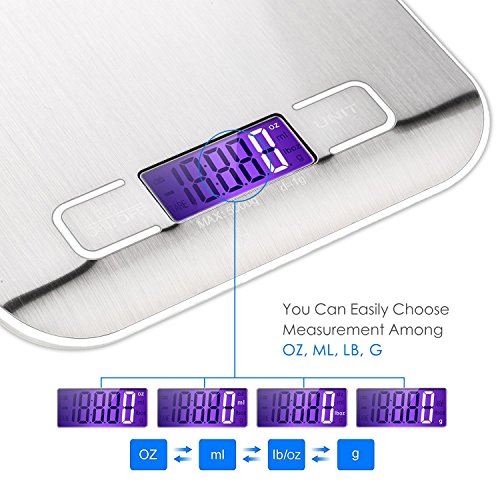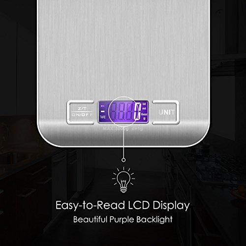 - Function: TARE function can reset the current weight on the scales to zero, low battery indication, quick unit conversion, volume measurement supported, violet backlit display.