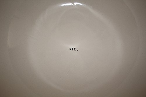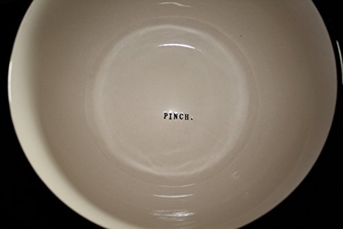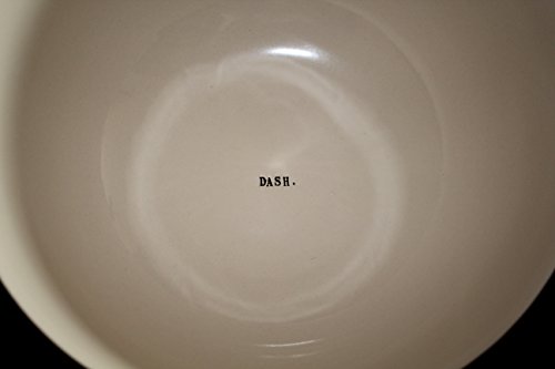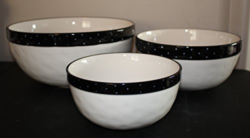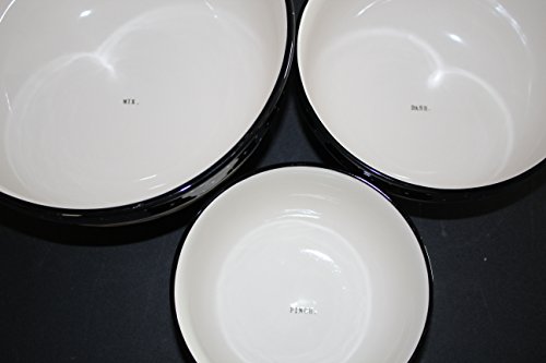 Rae Dunn by Magenta MIX. DASH. PINCH. in typeset letters 3 Mixing Bowl set with Black Polka Dot Rim 10 inch, 8 inch, and 6.5 inch Bowls.