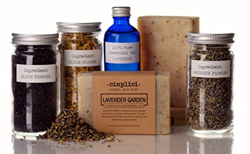 -. Feature : Pure lavender essential oil soothes the mind and body while elder flowers help clear the skin and elder berries add gently exfoliating texture in LAVENDER GARDEN. / Scent: Therapeutic grade lavender essential oil gives this bar a subtle and natural lavender scent. / Texture: Ground elder berries, lavender flowers and elder flowers give make this bar gently exfoliating. / Color: Creamy off-white with little dark specks. / SIMPLICI natural bar soaps weigh 4.5-5.5 ounces per bar. This pack contains 6 bars of Lavender Garden Soap. These bars are not individually wrapped or labeled. Six bars come in a lined, labeled and resealable bag