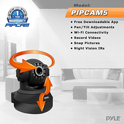 -. Binding : Tools & Home Improvement -. Brand : Pyle -. Color : Black -. EAN : 0068888755283 -. Feature : Wireless IP Camera for your Home or Office: Easy Installation Anywhere Within WIFI Range! / Remotely View and Monitor Activity from your Desktop or the IOS Android Compatible Pyle IP Pro App / Connect to iVideon and Record and View your Camera's History in the Cloud / Set Motion Detection to Get Push Notifications to Your Smartphone or Emails Alerting you to Activity / Add More PIPCAMs to your System and Monitor Multiple Locations: View up to 8 Cams from your Mobile -. Label : Pyle -. LegalDisclaimer : Must be at least 18& older to purchase. -. Manufacturer : Pyle -. ManufacturerPartsWarrantyDescription : Parts -. Model : PIPCAM5 -. MPN : PIPCAM5 -. NumberOfItems : 1 -. PackageQuantity : 1 -. PartNumber : PIPCAM5 -. ProductGroup : Photography -. ProductTypeName : SURVEILANCE_SYSTEMS -. Publisher : Pyle -. Studio : Pyle -. Title : PIPCAM5 Wireless IP Live Video Security Surveillance Camera - Remote Monitoring Mobile App PTZ + Intercom -. UPC : 068888755283 -. Warranty : 1 year limited