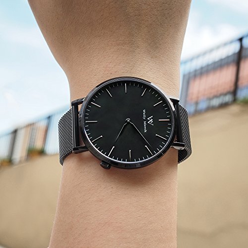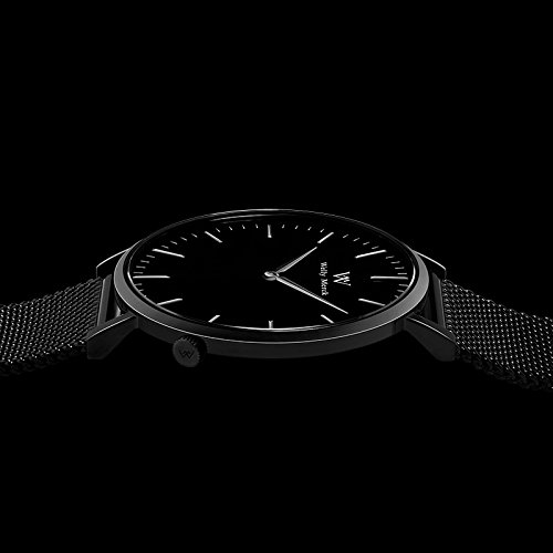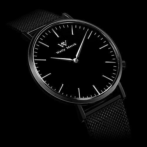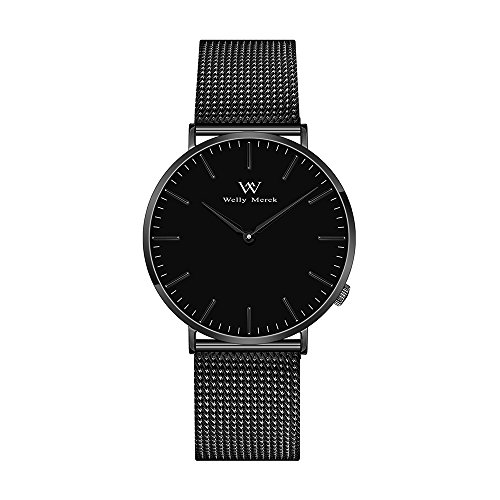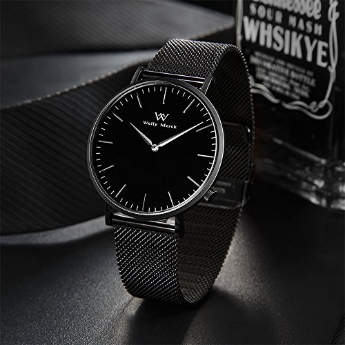 Welly Merck 얇 방수 레이디스 손목시계 36MM흑 문자판 스위스제 쿼츠 사파이어 유리 18MM 교환 가능 블랙 메쉬 스트랩 심플 남녀 겸용