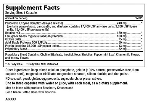 HELPS WITH DIGESTION: Betaine HCI, helps stimulate the production of hydrochloric acid. Pancreatin - a mixture of enzymes originating in the pancreas, helps break down proteins, carbohydrates, and fats. Pancreatin does its best work in an alkaline setting such as that found in the small intestine.
