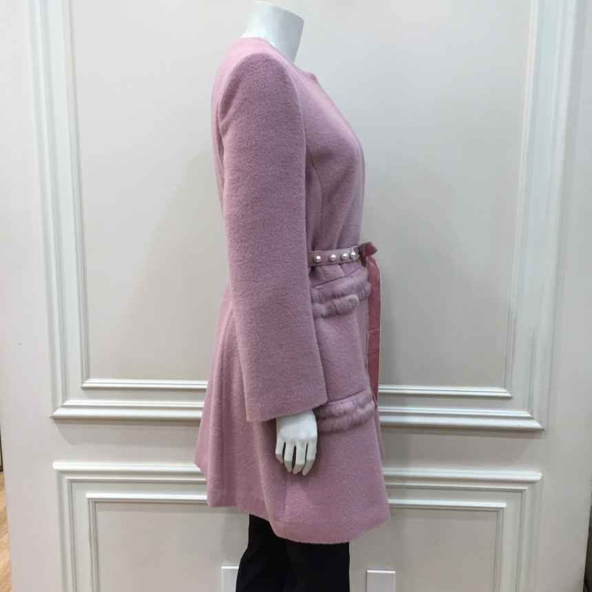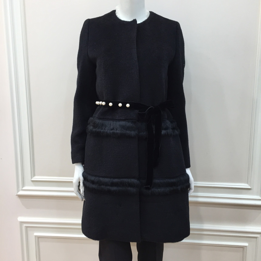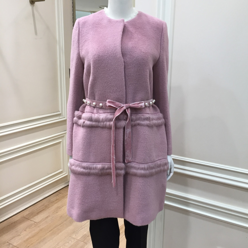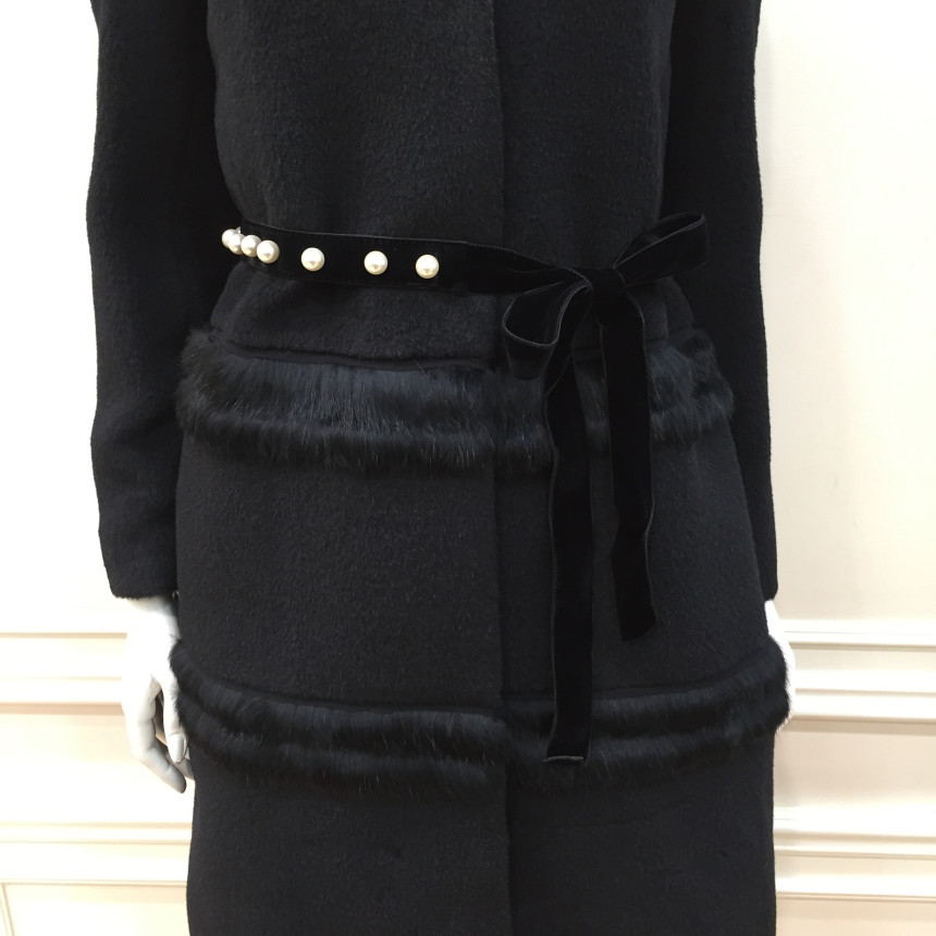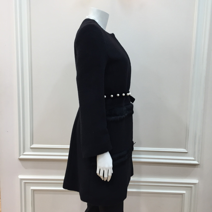 코트 몸판에 퍼 트리밍으로 포인트를 준 A라인 실루엣의 코트입니다.탈착 가능한 진주장식 허리벨트로 허리라인을 더욱 슬림하게 연출할 수 있는 제품입니다.앞중심을 스냅단추로 여미는 형식으로 겉으로는 보이지 않아 깔끔한 스타일입니다.