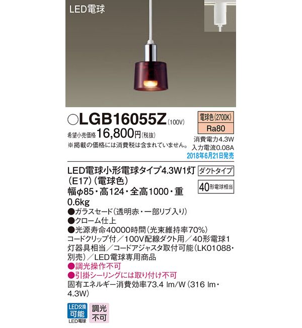 ●光源:LED電球小形電球タイプ4.3W1灯(E17)(電球色)、色温度:2700K、光源寿命40000時間(光束維持率70%)