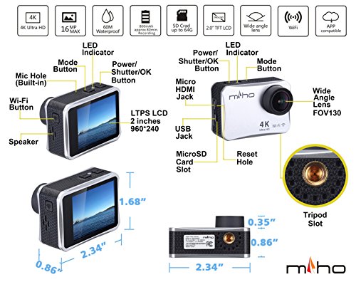We use high grade materials for this camera: 1) 2" 960x240 LTPS TFT LCD other than 320x240 LCD, it enhances a lot displaying quality; 2) 130-degree (FOV 130) Lens other than FOV 170: less distortion; 3) certified micro HDMI output: for lossless HD data transferring; 4) support up to 64GB microSD card (NOT INCLUDED): provides sufficient storage memory.