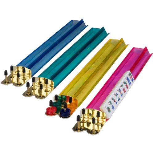 These classic mahjong racks have been popular since they first appeared on Bakelite sets the 1940's. The tiles are stacked on the front of the rack and betting coins are held safe on the side knobs. Set of four translucent racks include one of each color: Green, Blue, Yellow, and Pink.Feature