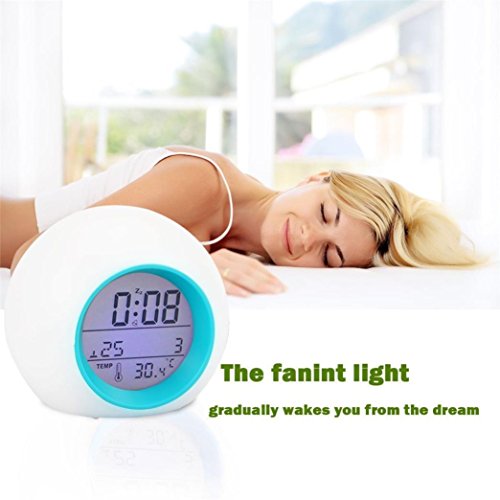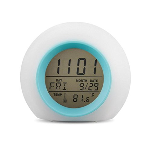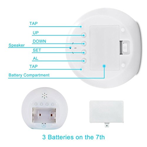 Product description: ?? Color:Blue ?? Best way to make your kids a good sleeping. ?? Best and most practical gift for Kids. ?? Digital Display: ?? Time/Date/Temperature/Week. Shift 12/24 hour format. ?? Environmental Temperature Display: ?? Measurement of 0 Degree-55or 32 Degree-122 DegreeF . ?? Easy to switch between Celsius and Fahrenheit temperature. ?? Night Light Changing: ?? Send out seven kinds of bright and warm colors with circular changing. ?? Alarm and Snooze Mode: ?? Natural songs help you never oversleep again. Perfect for heavy sleepers. ?? Stylish Design,Lightweight ?? Low Power Consumption ?? Require 3pcs AAA batteries(not inlcuded) ?? Operation Manual: ?? TAP -- Pause the alarm ?? Up-- Switch 12/24 hour mode, UP adjustment, turn on the alarm function ?? Down-- Switch the temperature mode, Down adjustment, turn on the alarm function ?? Set -- Switch the type you need to adjust ?? Al -- Switch the clock and alarm mode