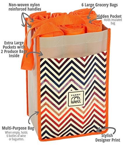 EVERYTHING YOU NEED IN ONE SET - 6 sturdy, foldable grocery bags with handles, 2 mesh produce bags, 1 insulated freezer bag with zipper enclosure and a fashionable 6 bottle wine tote.