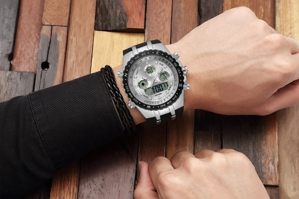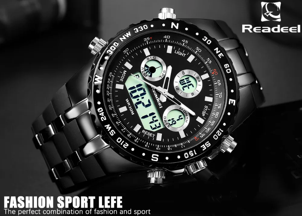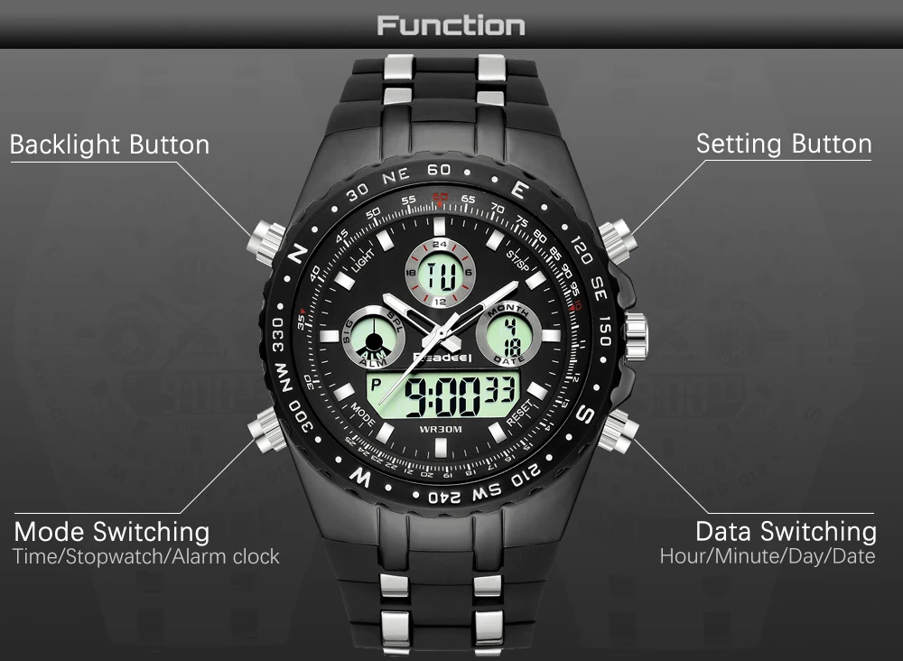 Feature:Water Resistant,LED display,Multiple Time Zone,Stop Watch,Complete Calendar,Shock Resistant,Chronograph,Auto Date,Alarm