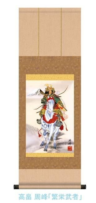 男の子の誕生と健やかな成長を祝い、将来の出世と無病息災を願う行事、端午の節句の掛け軸です。白馬を駆り先人を切る勇敢な若武者に、愛児を映す白馬に跨り一軍を率いる勇壮果敢な若武者の絵を飾り、大切なわが子の逞しい成長と大きな夢を託します。 |