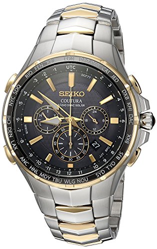 -. Binding : Watch -. Brand : Seiko -. Color : Black -. Department : mens -. Feature : Featured in two tone / Chronograph watch / World time function featuring 25 time zones / Automatically receives radio signals to precisely adjust the time and calendar / Chronograph measures up to 60 minutes in 1/5 second increments -. Label : Seiko -. Manufacturer : Seiko -. ProductGroup : Watch -. ProductTypeName : WATCH -. Publisher : Seiko -. Studio : Seiko -. Title : Seiko Men's Radio Sync Solar Chronograph Two-Tone Watch With Black Dial