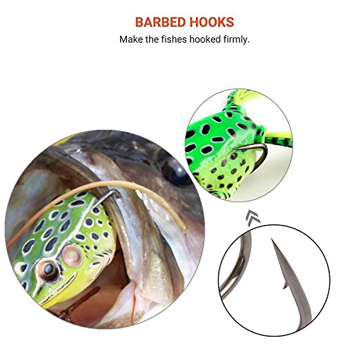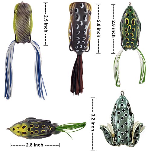 -. Feature : Made of environmentally friendly PVC, imitates the taste of frog and prevents the fishing hook from being spitted. Bright colors and 3D eyes to attract bass,trout,pike, musky, and more fishes. Definately an essential lures to any tackle box. / Lifelike Design makes it a powerful catching tool: High-resolution body detail and life-like swimming actions like a real frog or bullfrog, bring maximum performance, help to attract the target fishes. / High quality components, a super soft hollow body construction, and a weedless design with 2 hidden sharp hooks which make it more snag resistant, no worry about hanging up by lily pads or weed beds, and give it excellent hooking action. Especially ideal for topwater fishing. / Used P.R.Imarily for bass, pike and musky in freshwater. Easy to Carry: All topwater frog lures are packed in a small transparent box which is easy to carry, and convenient to get the exact one you need. / Package included: 5 different kinds of frog lures (2-legged frog, frogs with skirts, popper frogs with skirts) to choose from for different fishing situations. Must be a great attractive catching tool with the smooth and rapid diving action