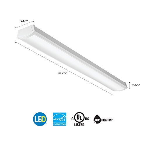 Technical Specifications: Power: 40W Input Voltage: 120V (Connects directly to power supply via provided UL recognized driver) Luminous Flux: 2380 LM Emitting Color: 4000K (Bright White) Dimmable: NO Light Source: LED CRI: 85 Dimension: 47.4 x 5.5 x 2.6in Light direction: General Average life: 50,000 hours Warranty: 5 years – Limited/ Electrical: Long-life LEDs, coupled with a high-efficiency driver, provide extended service life. Standard input = 20/40 watts (2’/4’), 60 lumens per watt. Fixture operates at 120 volts, 60Hz. Meets Highest Industry Standards: UL certified in the USA and Canada, Energy Star Rated, and Damp Listed More electrical information and complete list of compatible dimmers are located on spec sheet How many LED lights do I need for the room? FMLWL 24 840 (2 foot)
