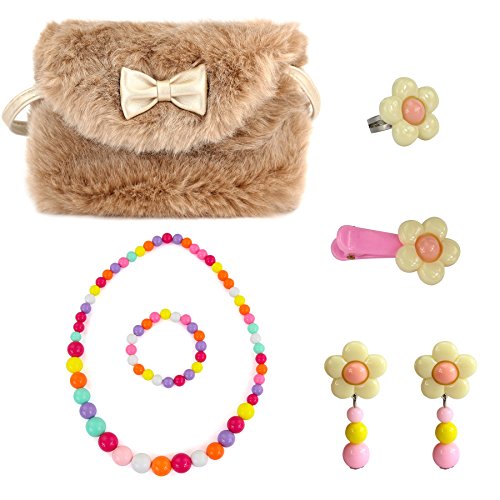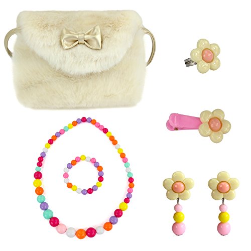 ❤ VALUE FOR MONEY - Its absolutely adorable and for the price, its well worth it.Includes 1 handbag, 1 pair of clip-on earrings, 1 flower ring, 1 flower hair clip, and a set of matching colorful beaded necklace and bracelet.