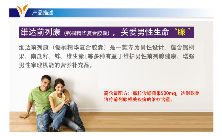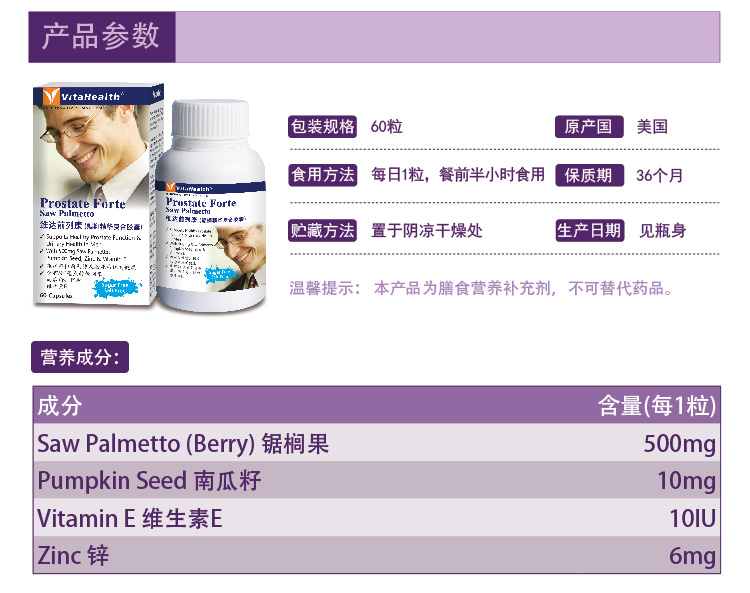 VitaHealth Prostate Forte is a specially developed Saw Palmetto formula which combines Saw Palmetto with Pygeum, Pumpkin Seed, Vitamin E and Zinc to promote prostate and urinary health in men. Saw Palmetto Berry, Pygeum Africanum and Pumpkin Seed Oil are natural plant ingredients which work synergy to promote prostate health. Zinc and Vitamin E are added to provide antioxidant support & protect body cells from free radicals damage.