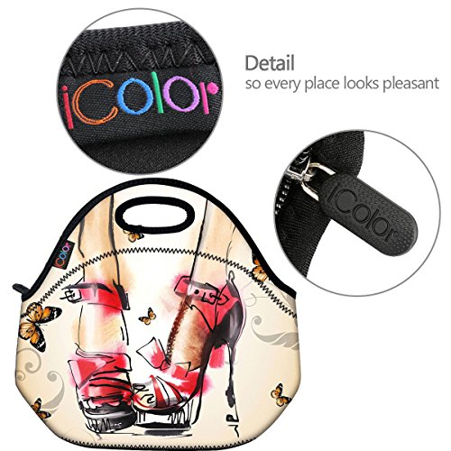 IDEAL FOOD TEMPERATURES: Our ICOLOR Lunch Bags Made of Fine Neoprene Material,Vinyl-free, PVC-free lunch bag keeps your food cold or hot depending on your needs, the Fabric Keeps Food Hot/Cold for 2-4 Hours,if Use with a ice Pack,it will Insulated a longer time,so you can enjoy perfect tasting meals whenever it's time for lunch.