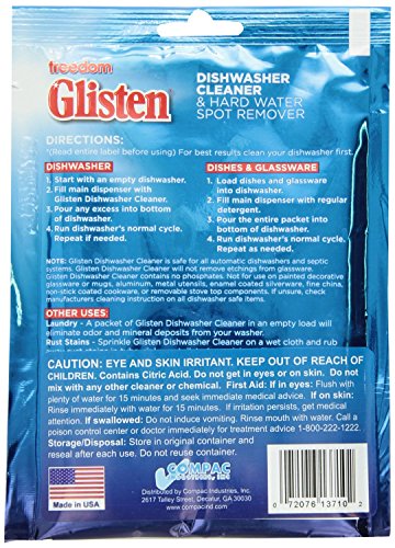 -. Binding : Health and Beauty -. Brand : Compac -. EAN : 0601579032005 -. Feature : Dishwasher Cleaner and Hard Water Spot Remover / Super Concentrated, Cleans Freshens & Maintains Dishwashers / Removes Cloudy Film and Spots from Dishes and Glassware / Use in your washing machine - A packet of Glisten in an empty load will eliminate odor and mineral deposits / Pack of 2 - each packet contains 2 oz -. IsAdultProduct : 0 -. Label : Compac -. Manufacturer : Compac -. PackageQuantity : 2 -. ProductGroup : Health and Beauty -. ProductTypeName : HEALTH_PERSONAL_CARE -. Publisher : Compac -. Studio : Compac -. Title : Compac’s Freedom Glisten—Automatic Dishwasher Cleaner & Hard Water Spot Remover—Removes Cloudy Film & Spots From Dishes & Glassware—Cleans, Freshens & Maintains Automatic Dishwashers 2 Uses -. UPC : 601579032005