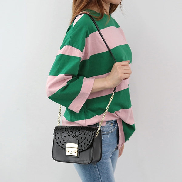 |  봄 신상 체인백입니다! 깔끔한 디자인에 펀칭이 포인트가 되어 시선을 사로잡는 아이템이에요! 미니사이즈의 체인끈으로 펀칭이 들어가 있는 스퀘어 백으로 고급스러운 소재로 제작되어 퀄리티 좋은 아이템이랍니다. 어떤 코디와도 매치 가능한 만능 패션아이템으로 강추해드려요! 상세페이지 꼼꼼히 확인 후 굿 초이스해주세요~           | COLOR | 블랙 / 아이보리 / 핑크 / 그린 | | 제품 색상은 모니터에 따라 실제 색상과 차이가 있을 수 있습니다. | | | | FABRIC | 합성피혁 | | | | PRODUCT ION | 제조국 / 중국 | | 품질보증기준 / 소비자분쟁 해결기준에 따름 | | A/S 책임자 및 고객센터 / 감성가방 | | | | SIZE INFO | 사이즈는 측정 방법에 따라 1~2cm의 차이가 있을 수 있습니다. | | 스트랩 길이는 연결 고리를 제외한 길이이며, 최대 길이입니다. | | (단위:cm, g) | | 가로 길이 | 세로 길이 | 너비 | 손잡이 높이 | 스트랩 길이 | 무게 | | 18 | 13.5 | 8.5 | - | 52(조절o) | 430 |  |